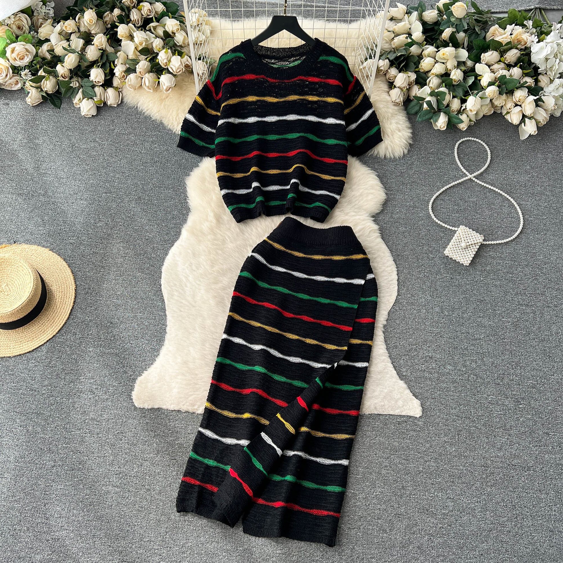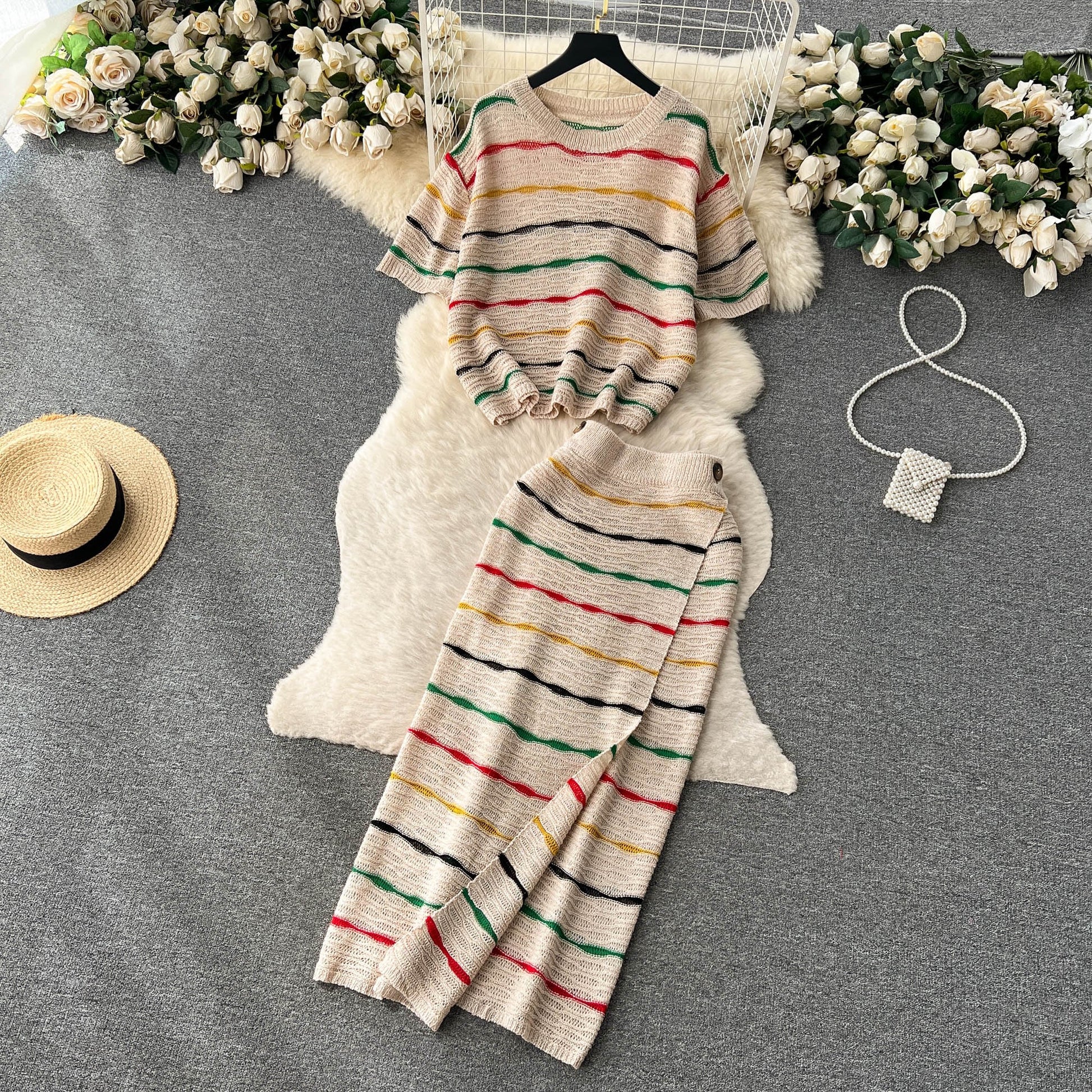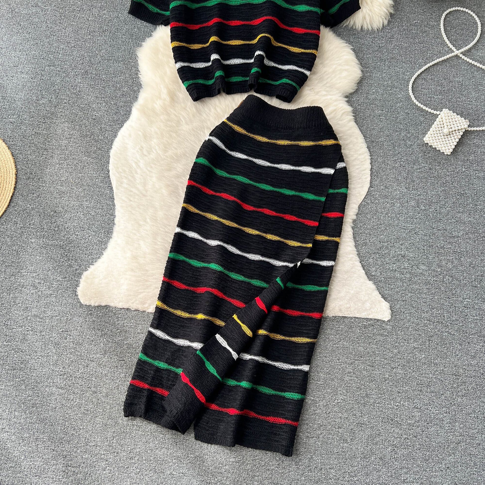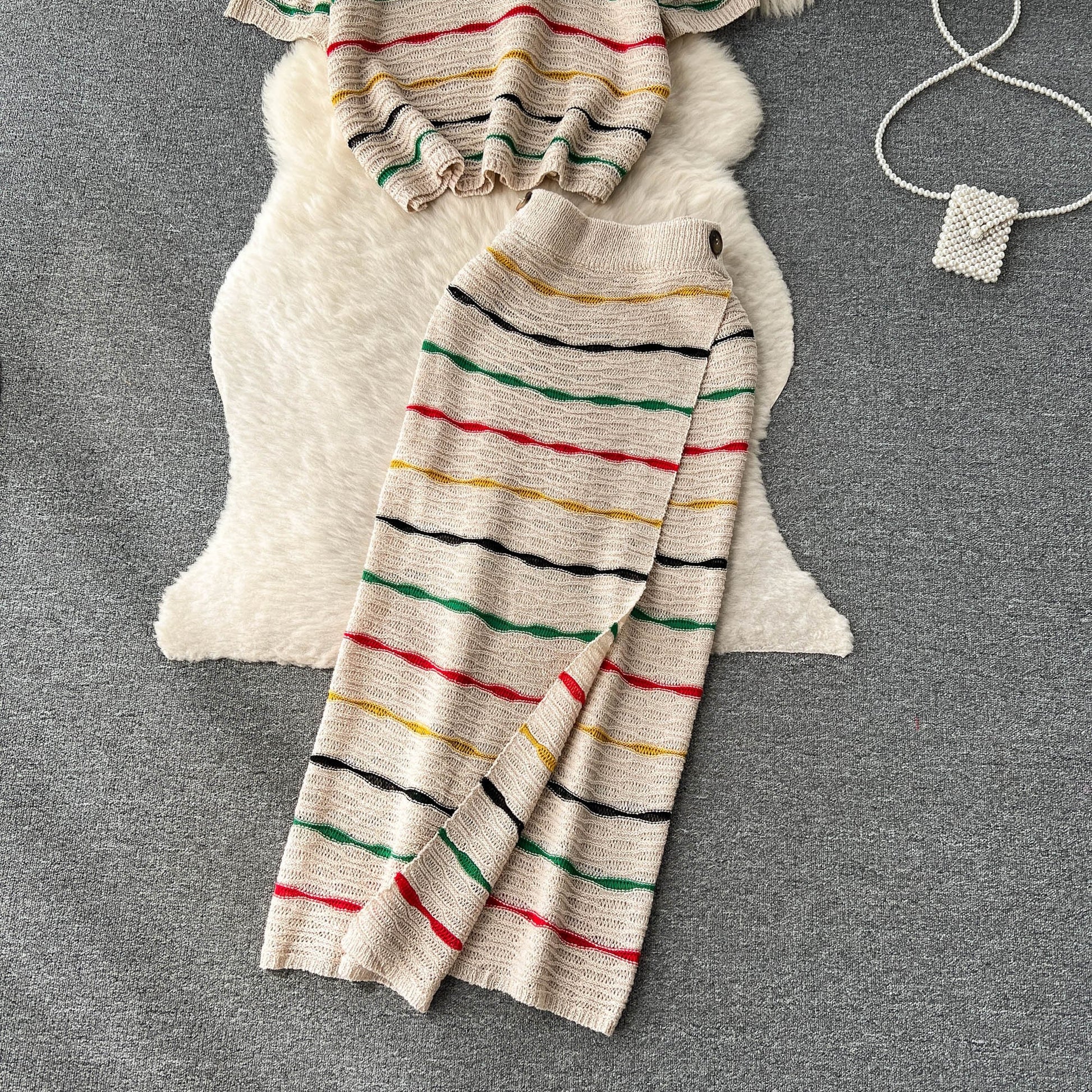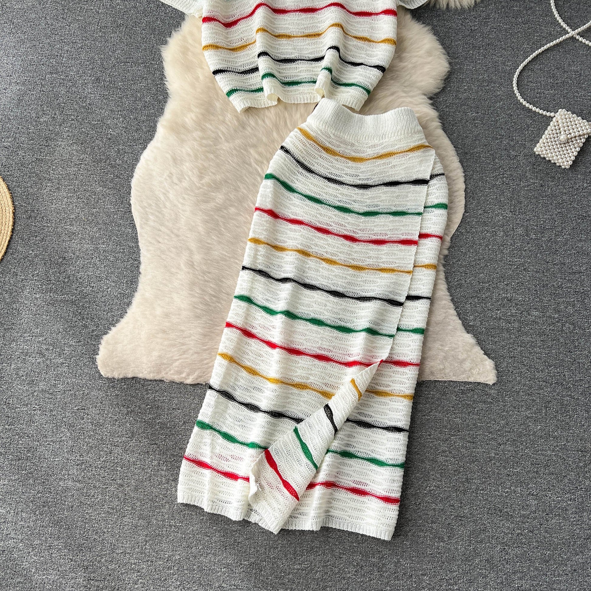【set】ストライプ柄ニットトップス+スカート2点セットG20661