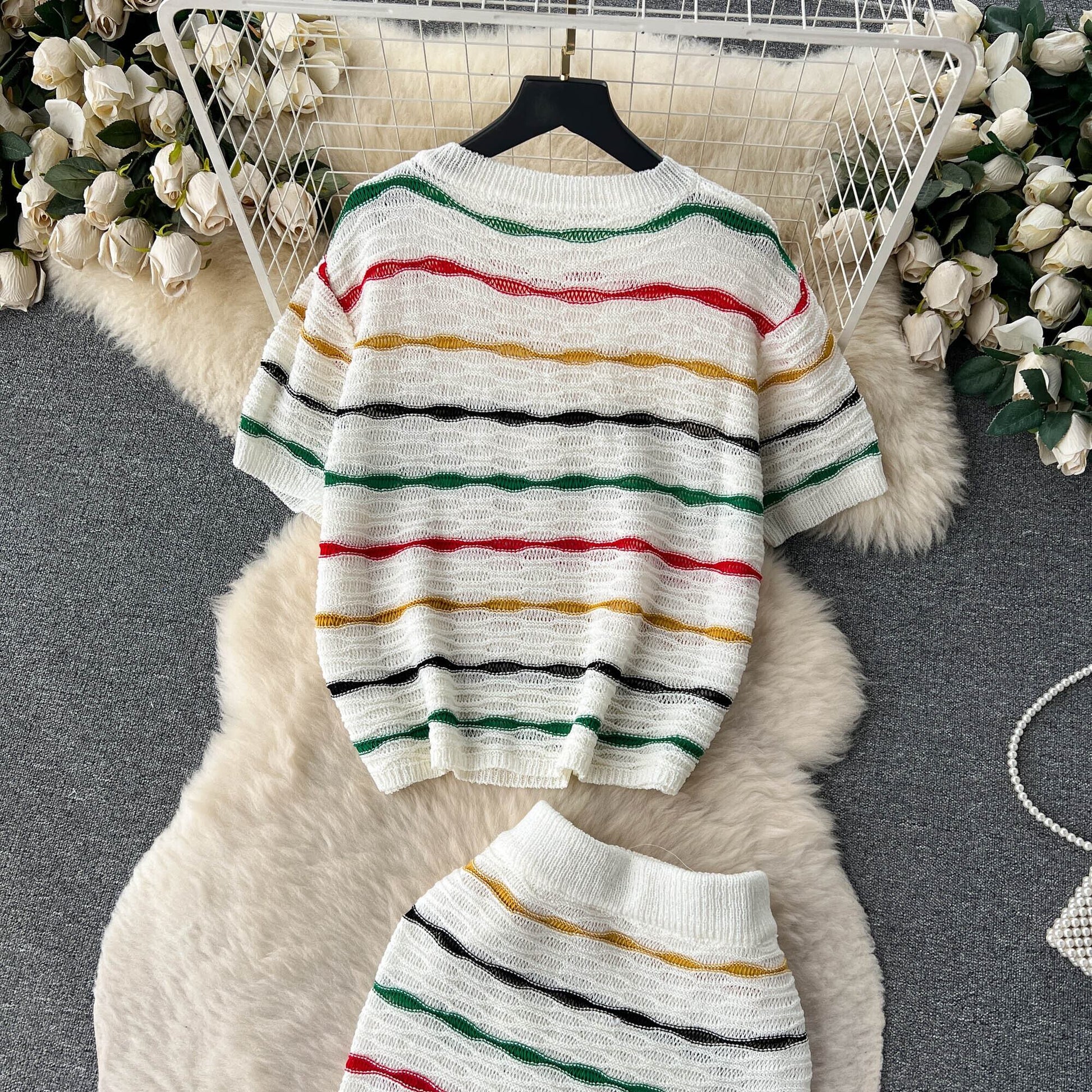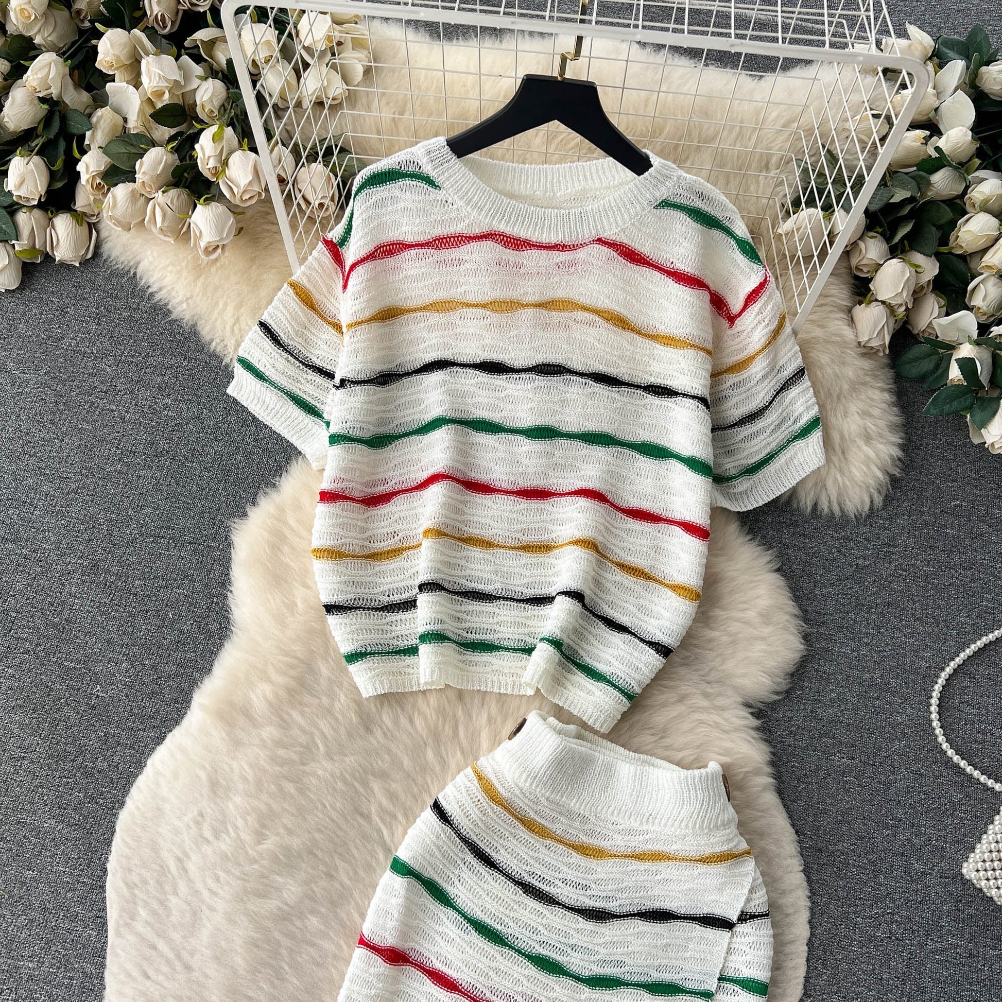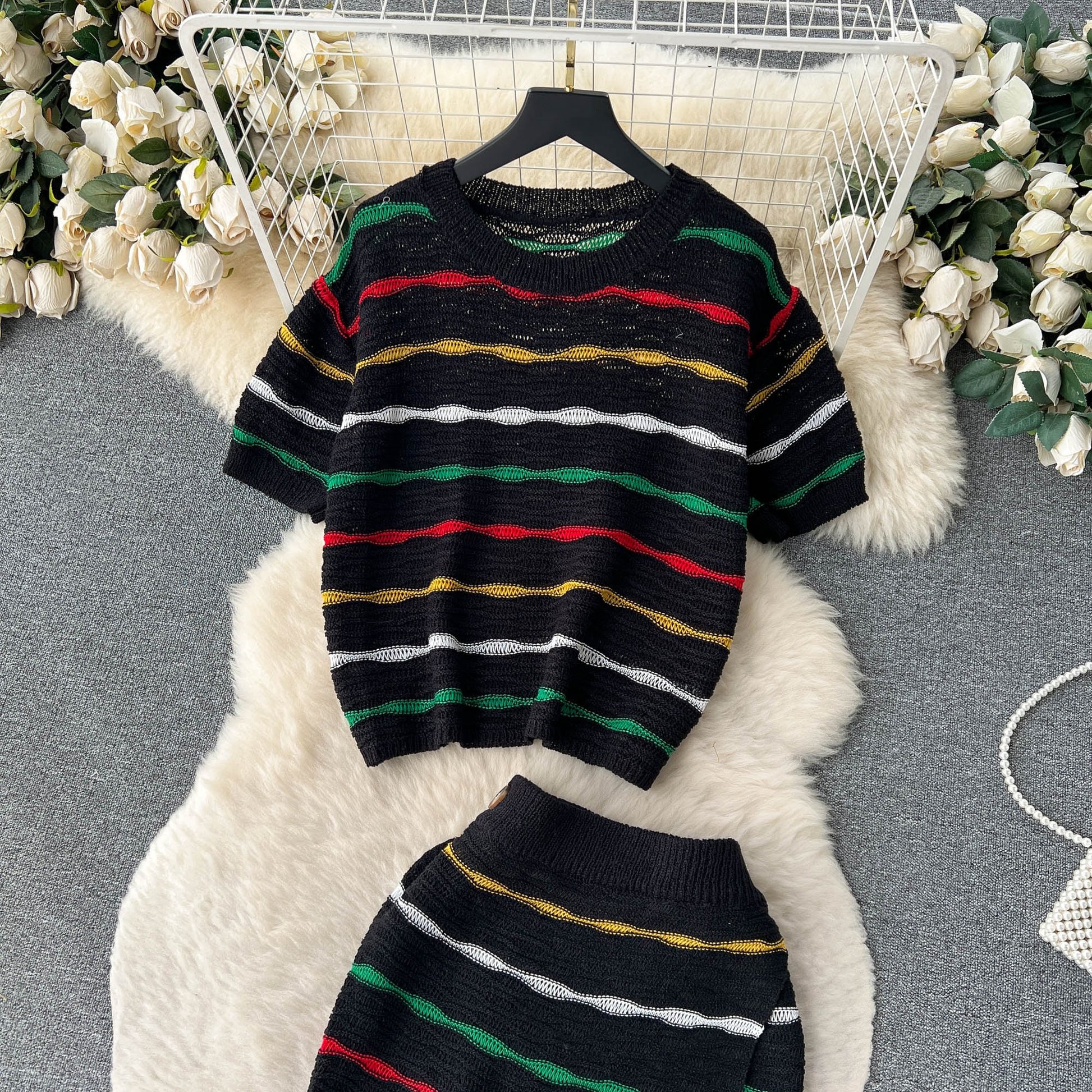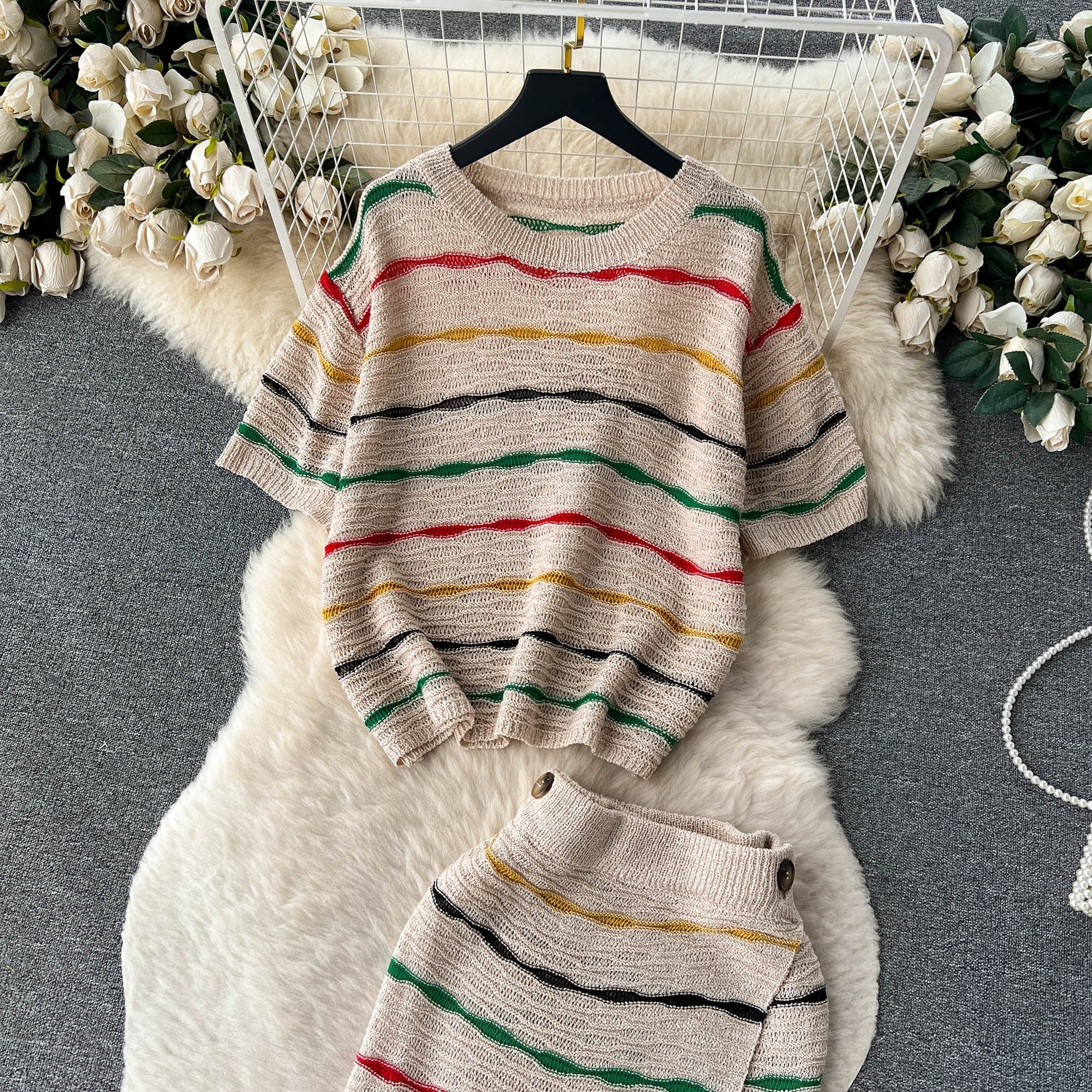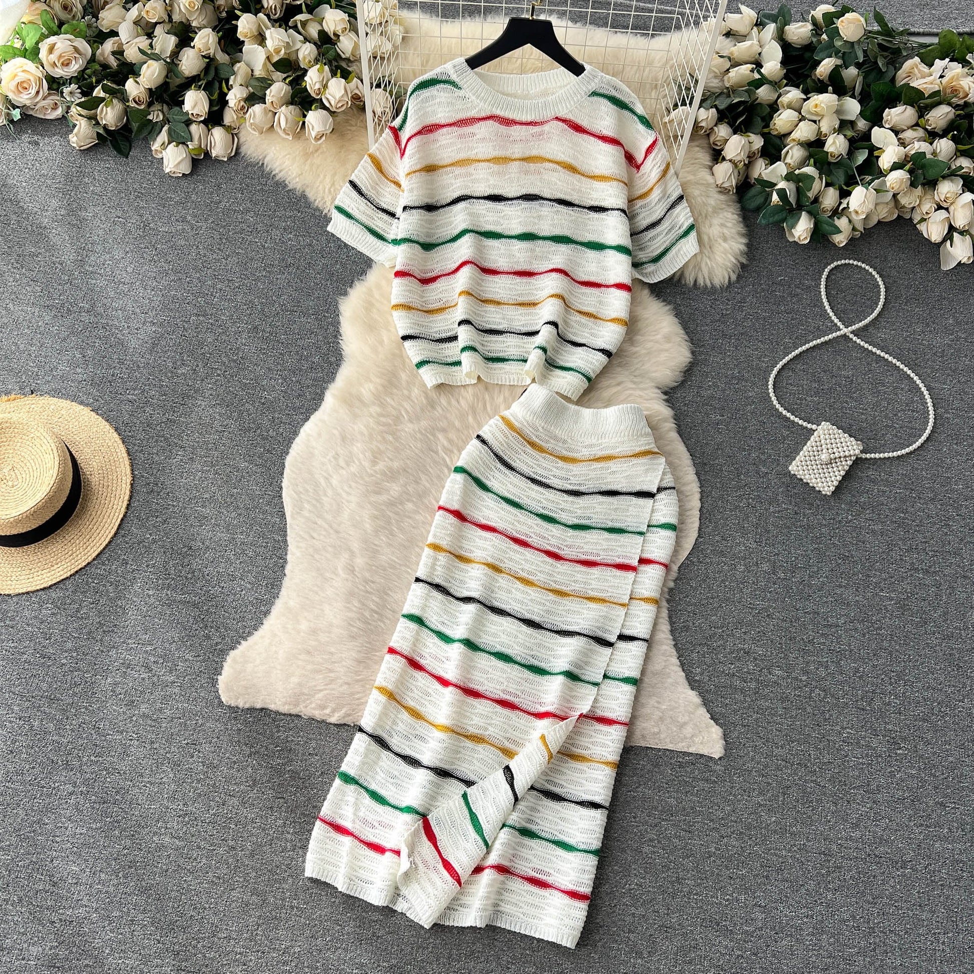 【set】ストライプ柄ニットトップス+スカート2点セットG20661