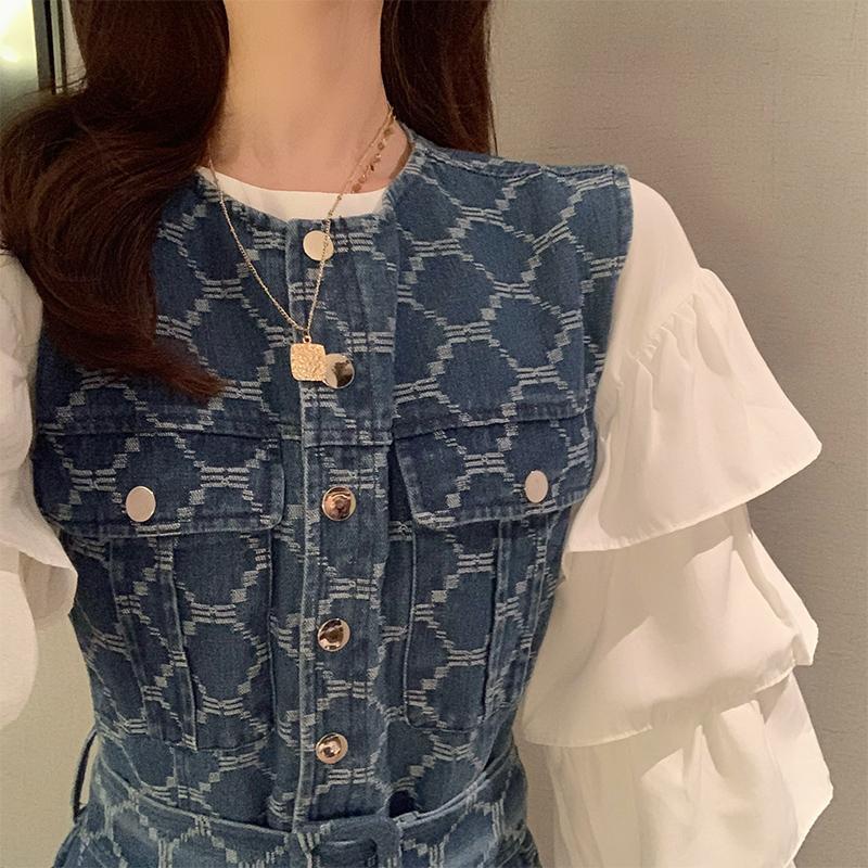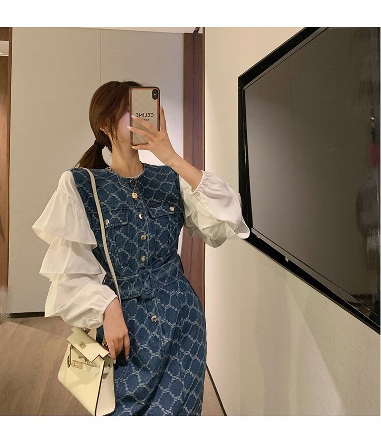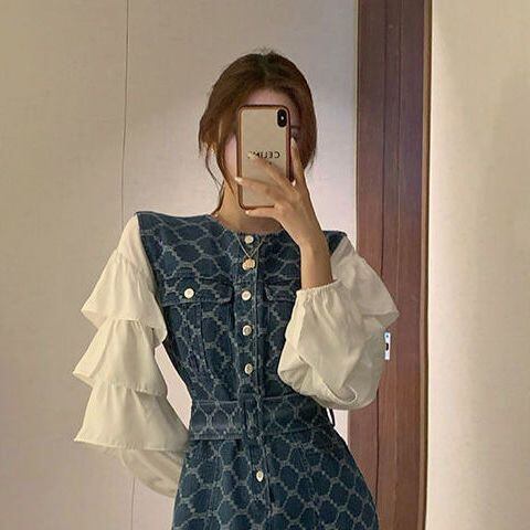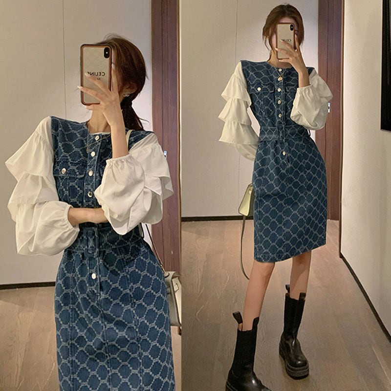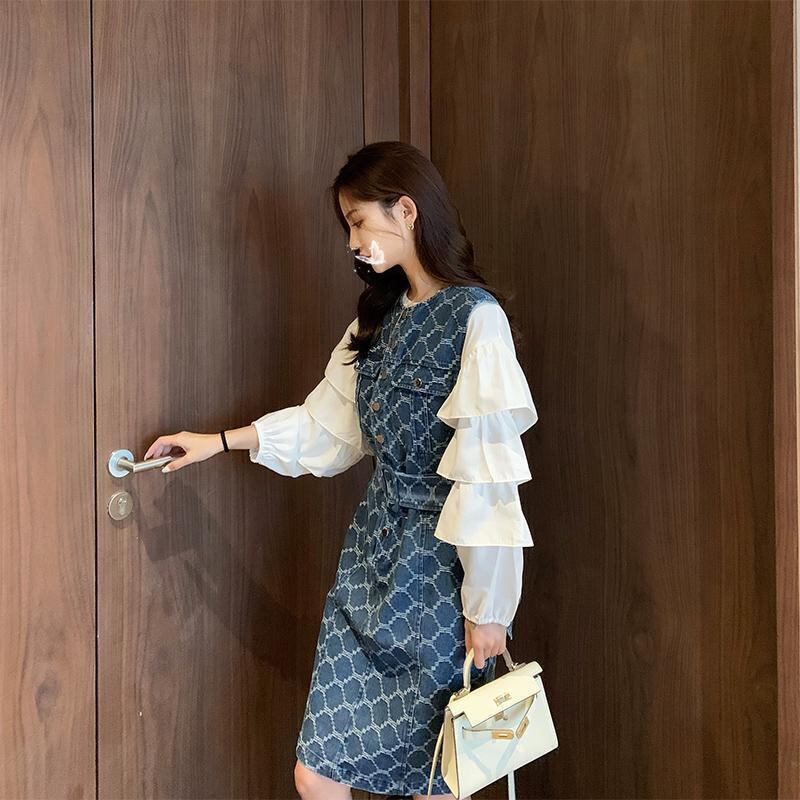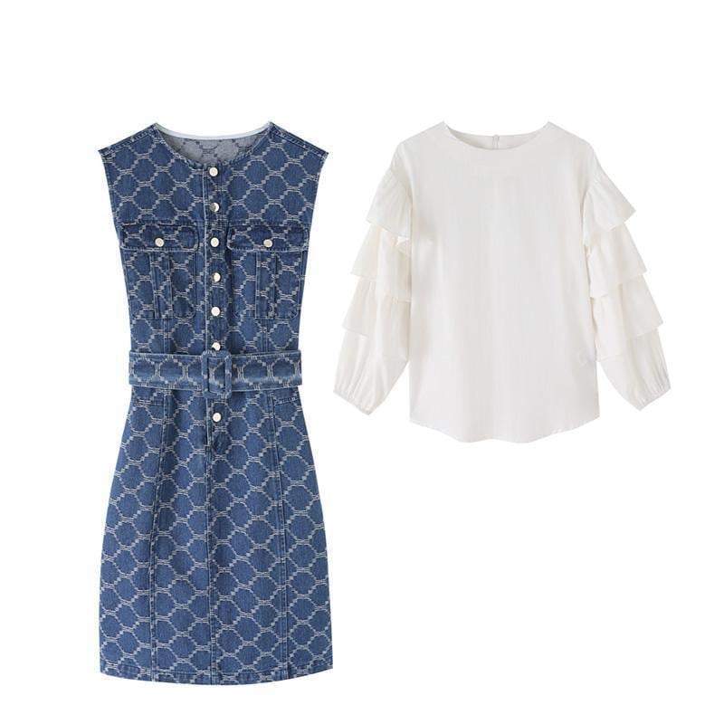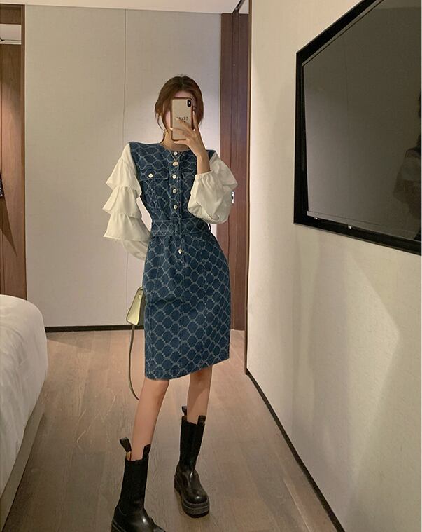 【set】清純甘くて女子力UP!気質満点ファッショントップス+デニムワンピース2点セット G9443