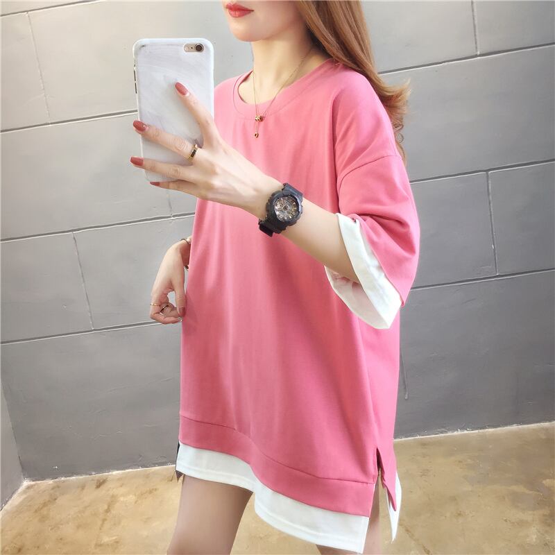 【tops】ラウンドネック半袖カジュアル偽二つ切り替え配色着まわしTシャツ