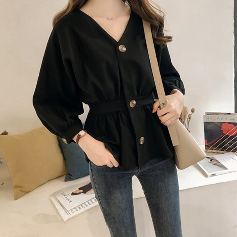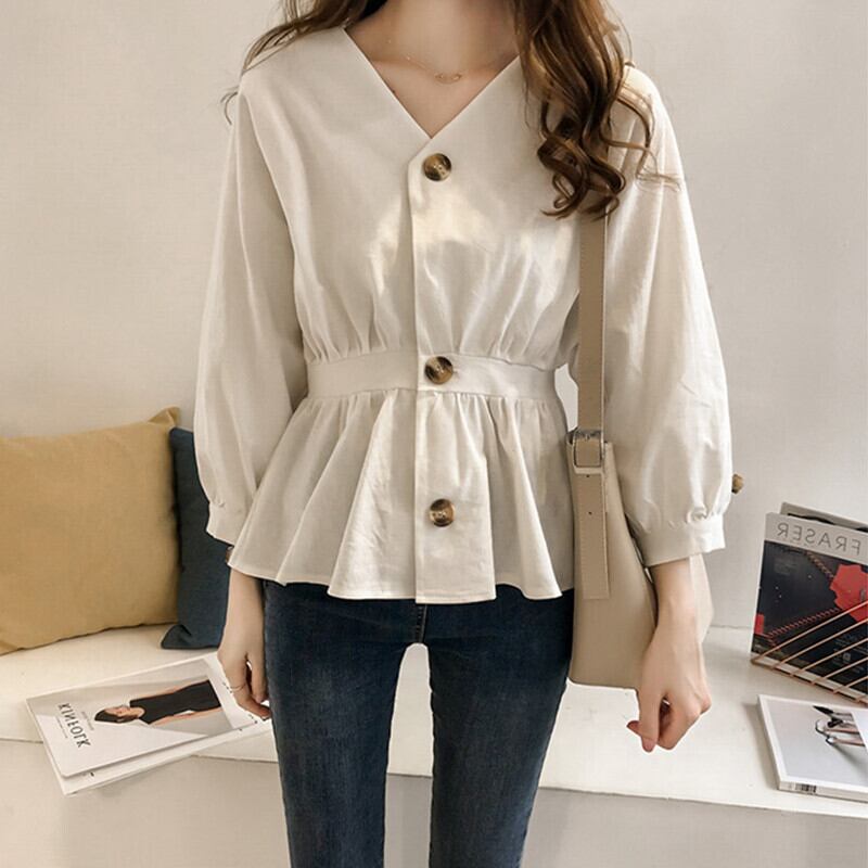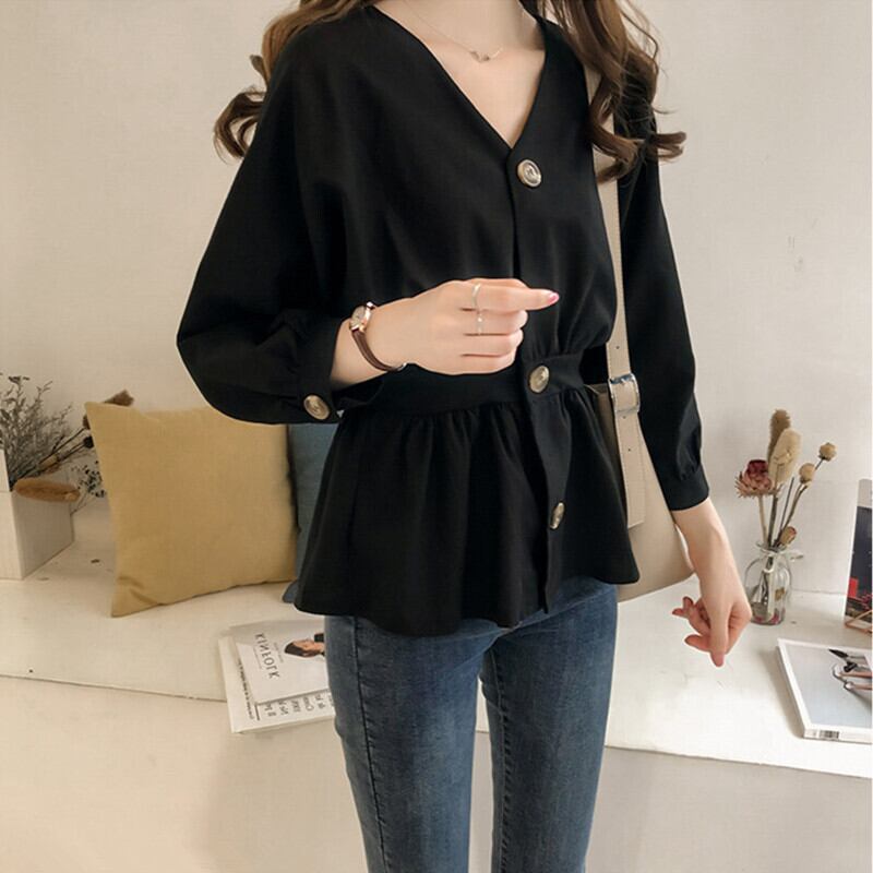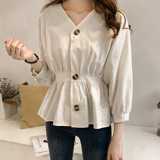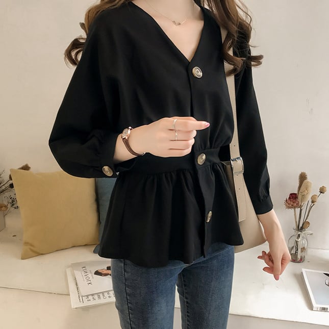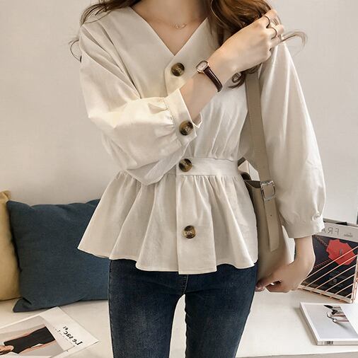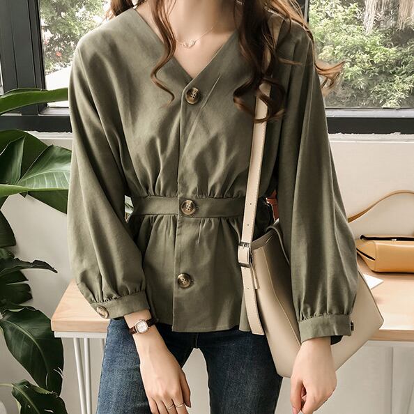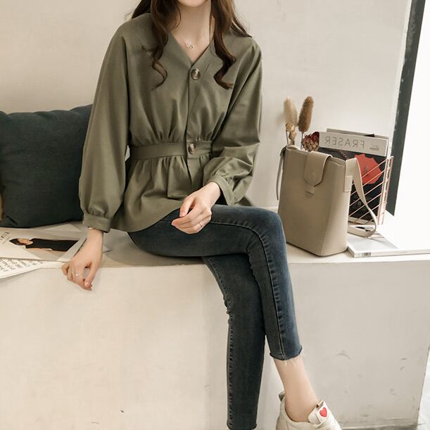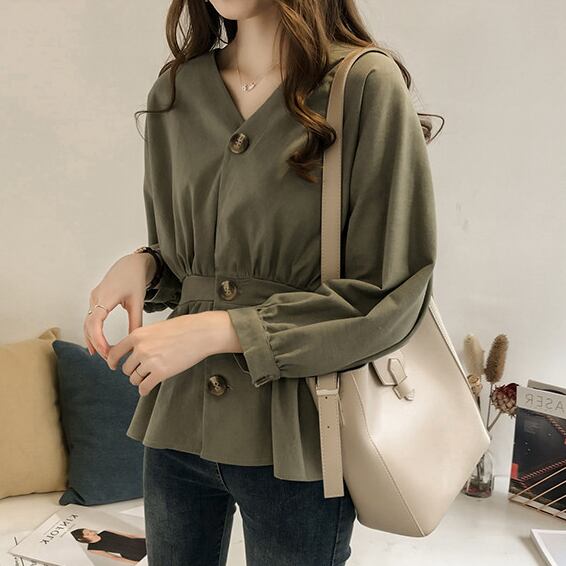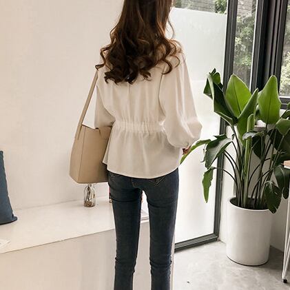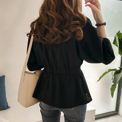 【tops】好感度満載!Vネック長袖ギャザーウェスト絞り無地ブラウス