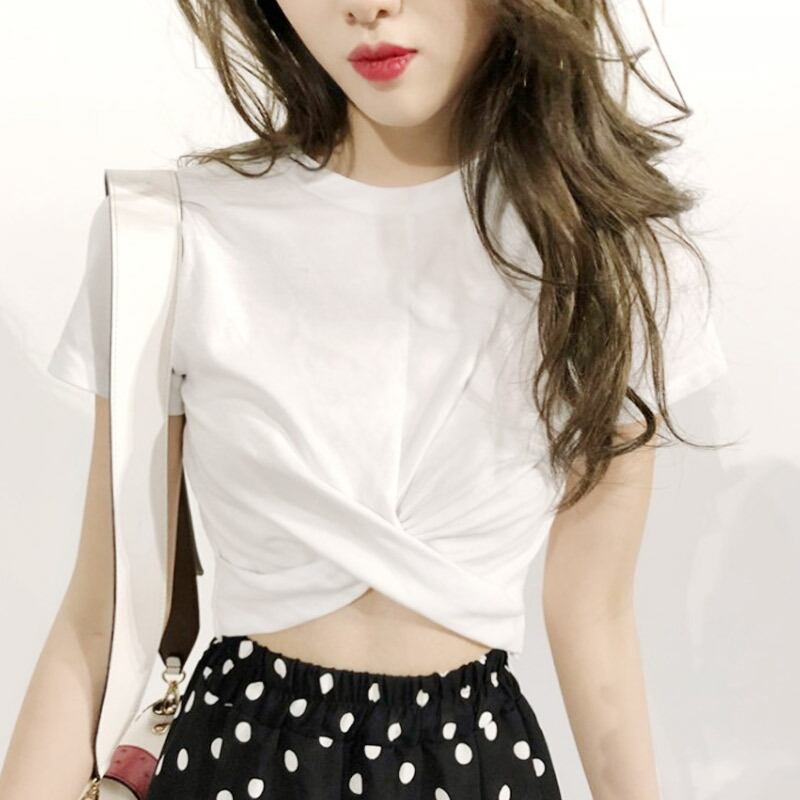 【tops】美人度アップラウンドネック半袖ファッションショート丈TシャツF0058