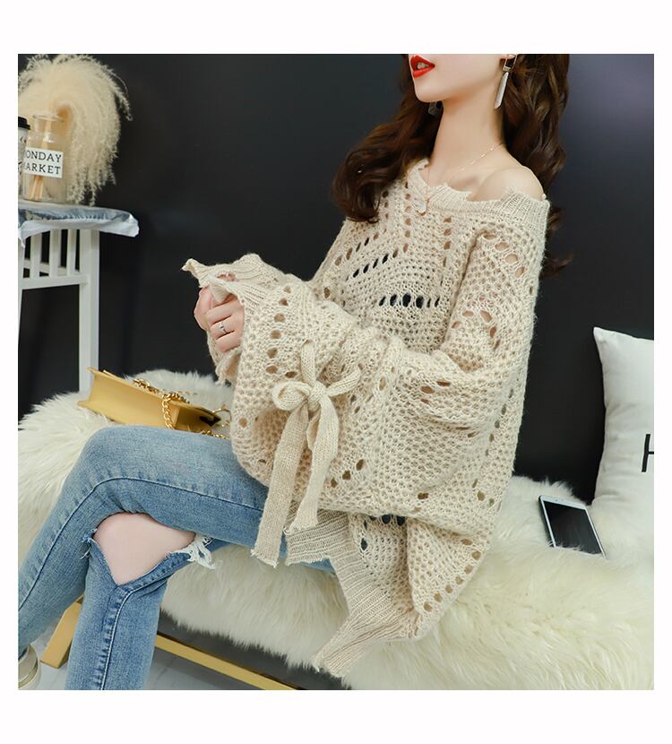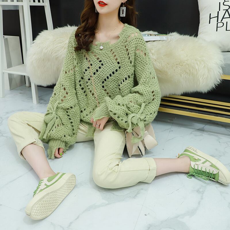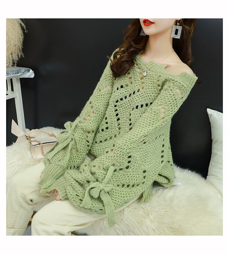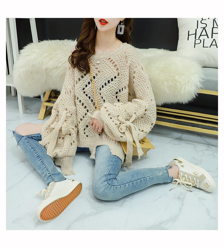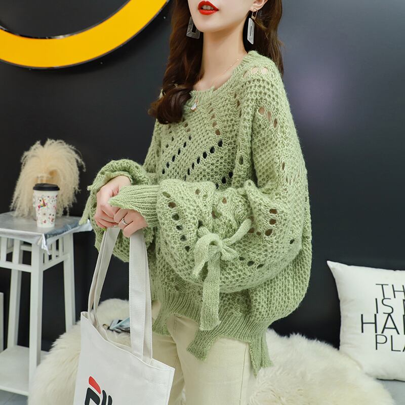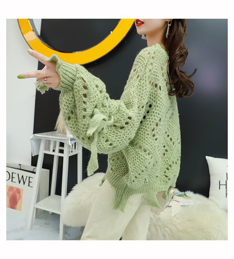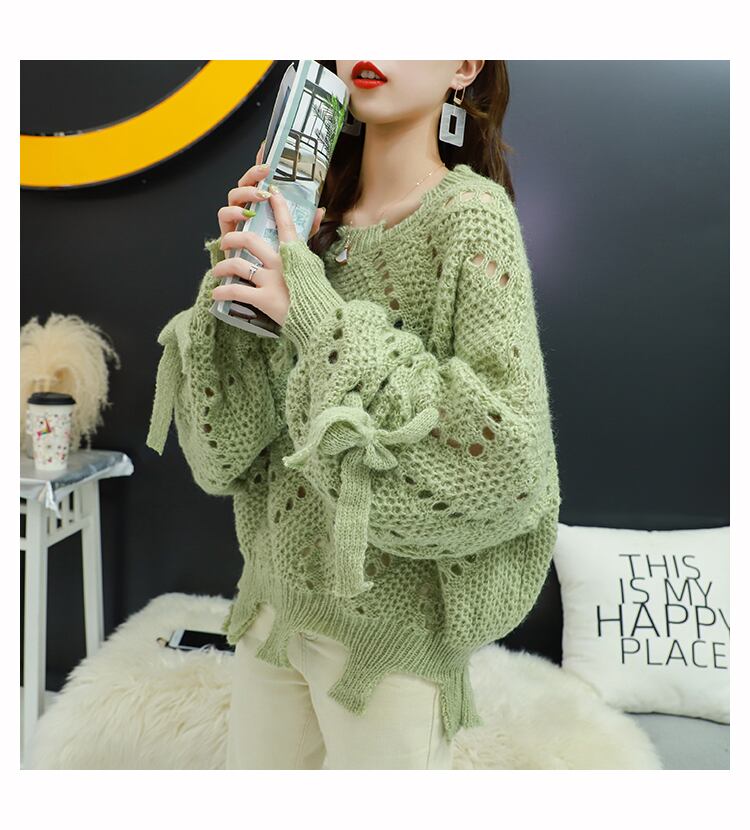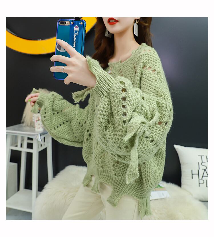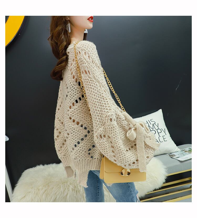 【tops】韓国ファッション3色ラウンドネック長袖透かし彫り薄手ニットセーターF0634