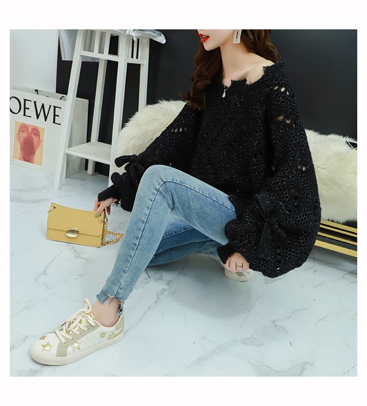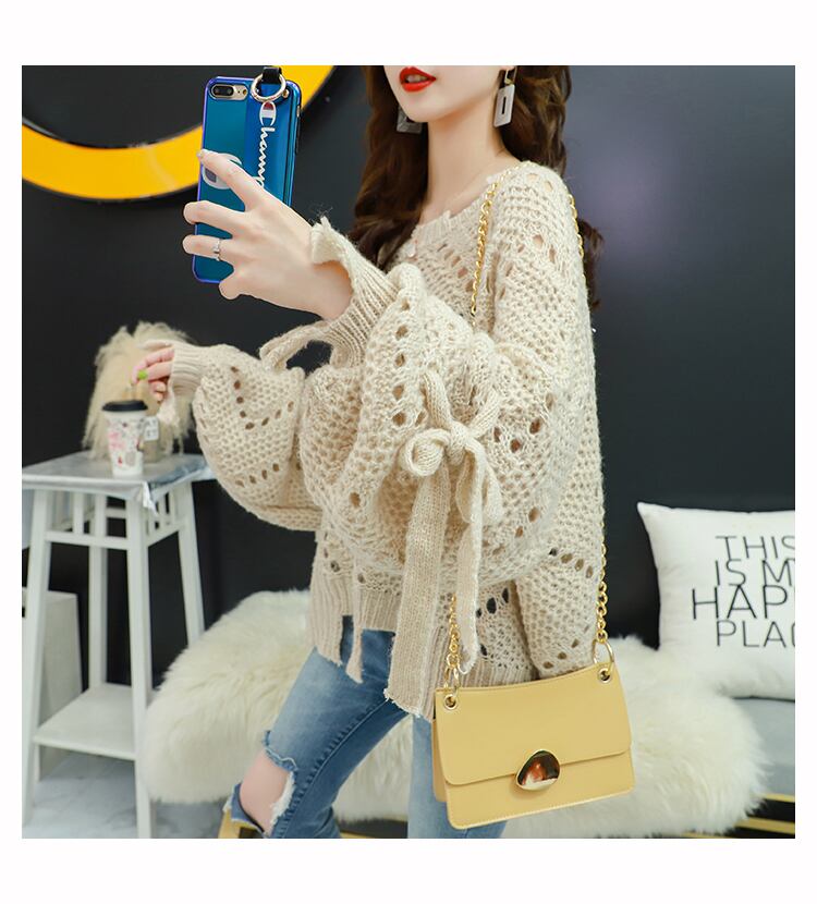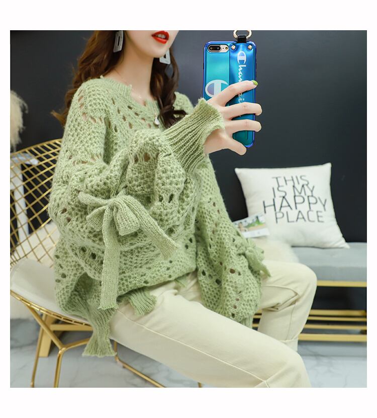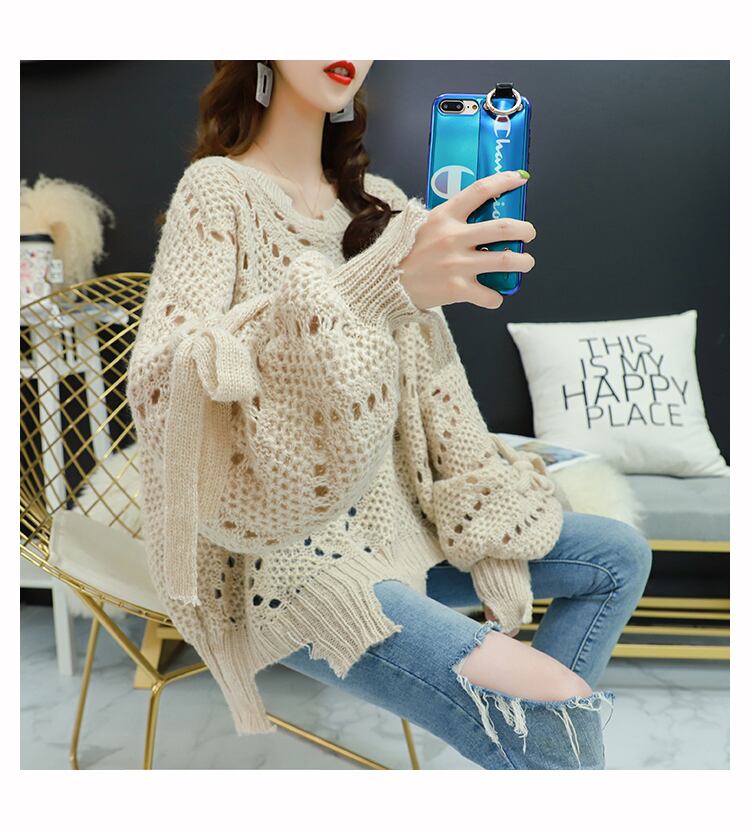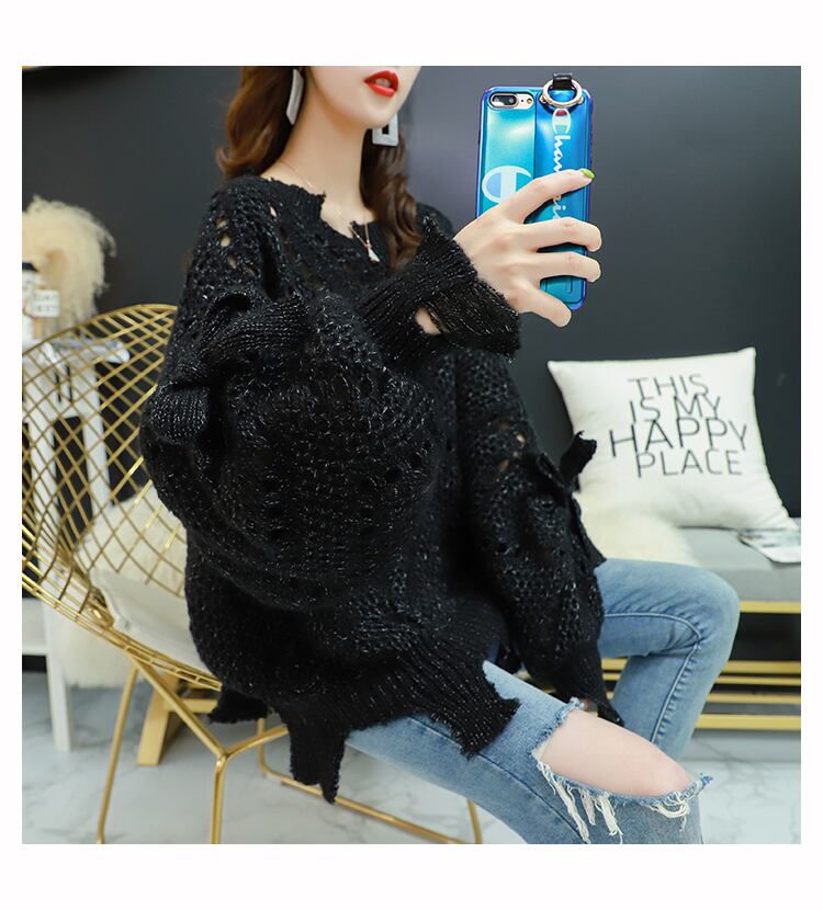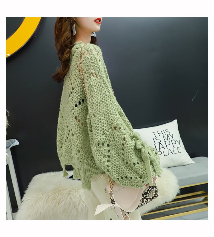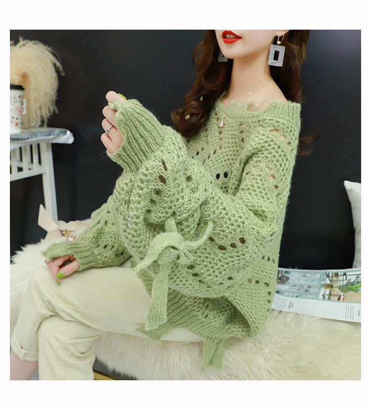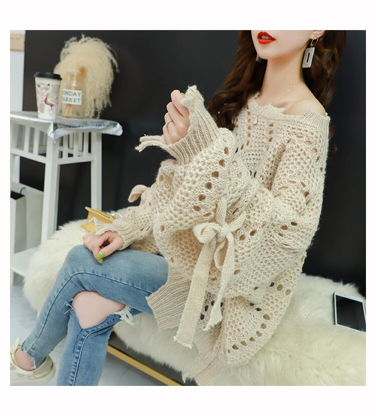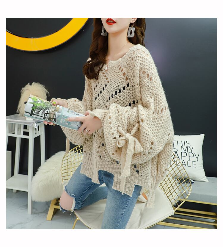 【tops】韓国ファッション3色ラウンドネック長袖透かし彫り薄手ニットセーターF0634