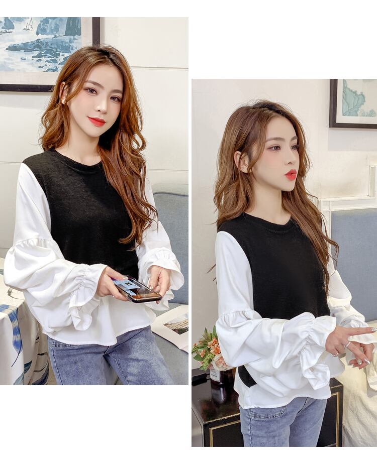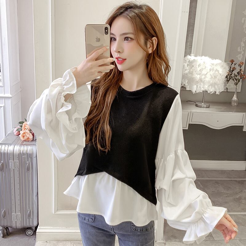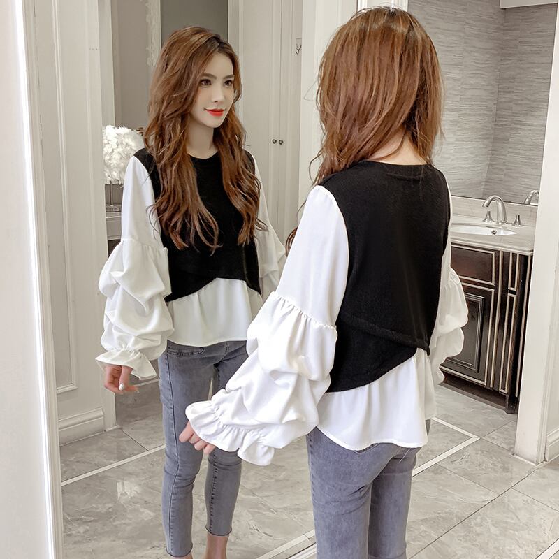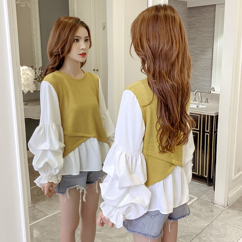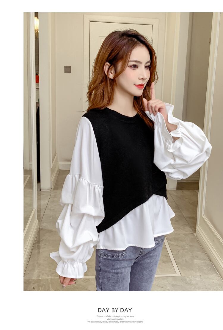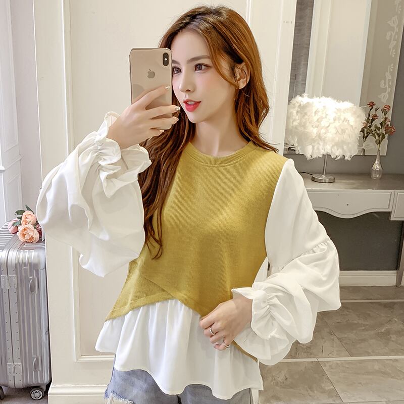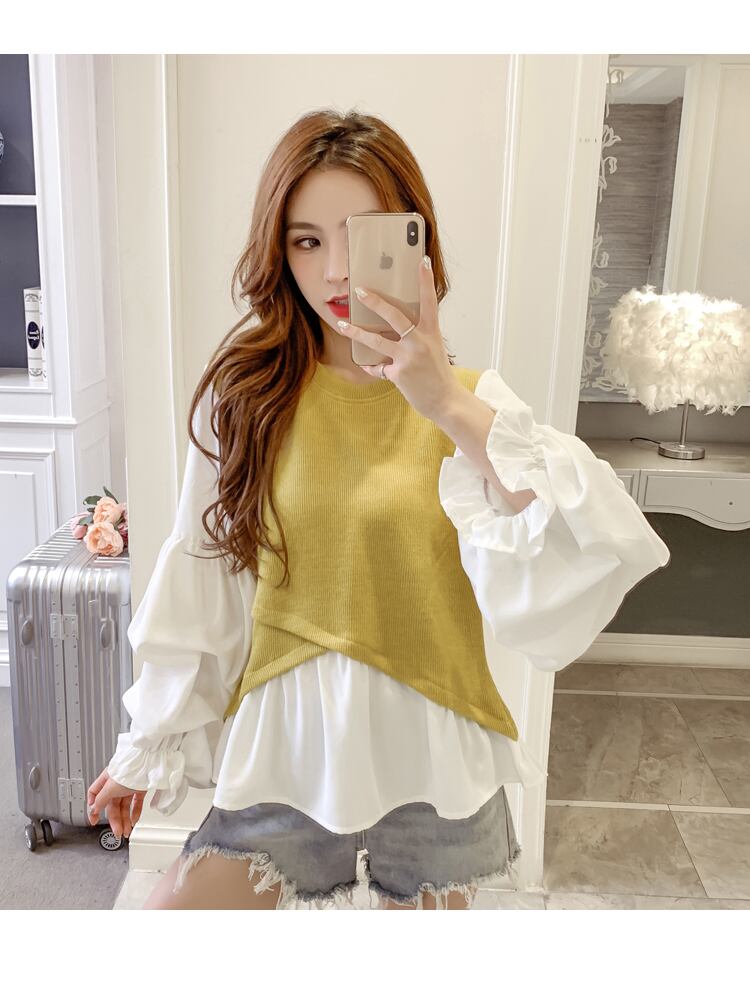 【tops】韓国ファッション早秋新作ラウンドネック長袖パフ袖偽二つ切り替えニットブラウスF0743