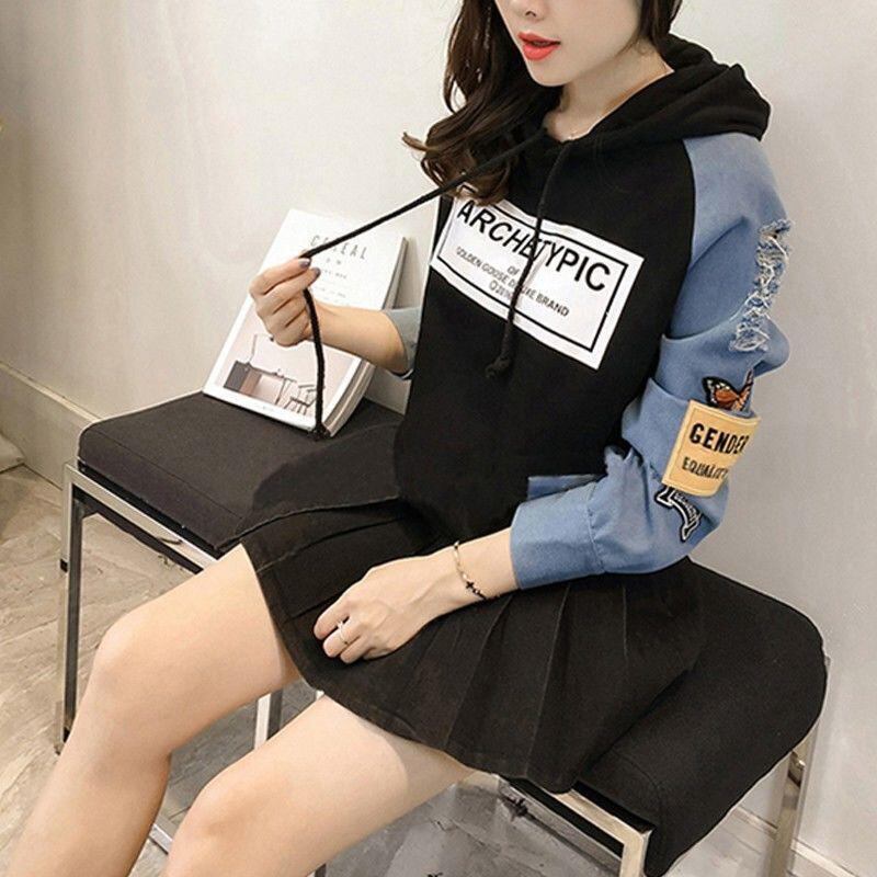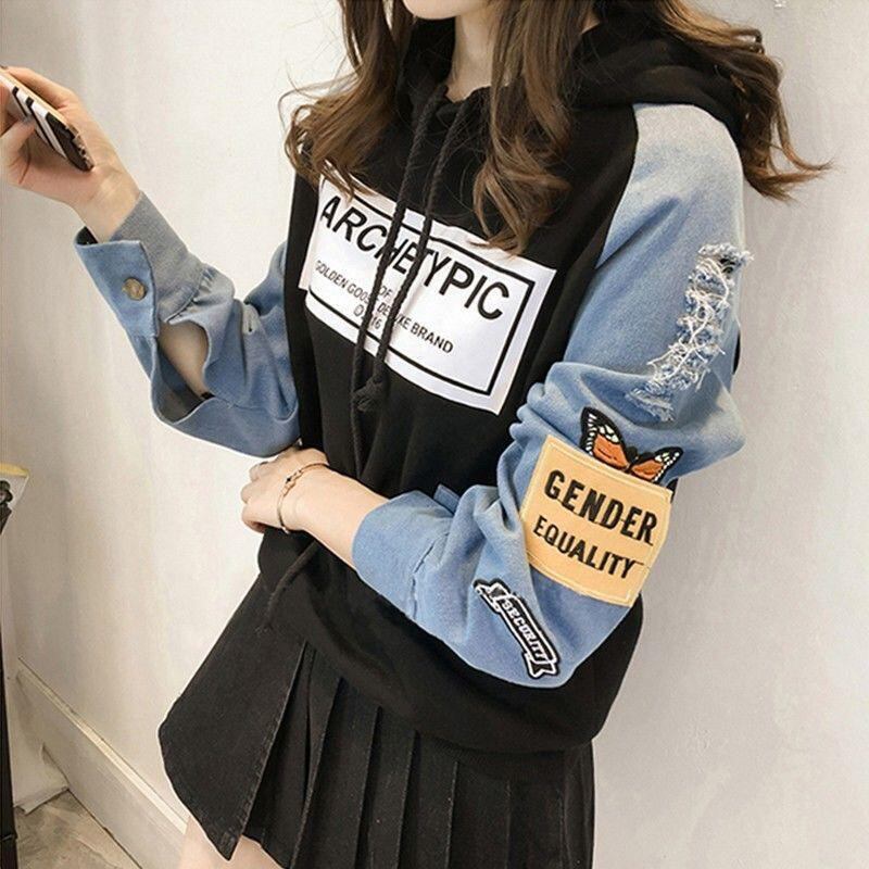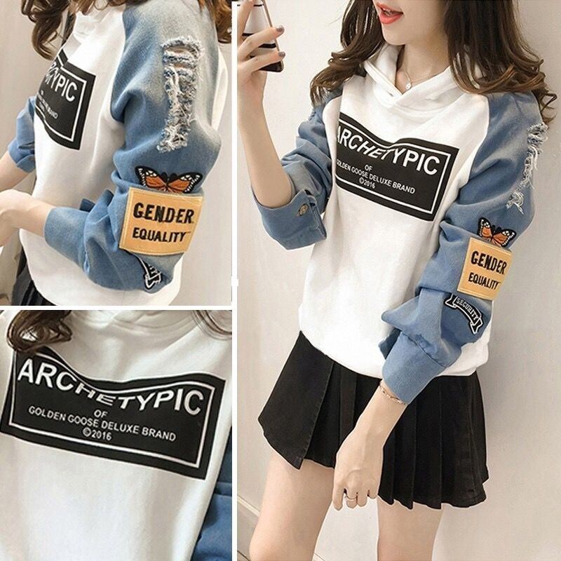 【tops】韓国ファッションフード付き長袖英字柄配色デニム切り替えゆったり着回しパーカーF0776