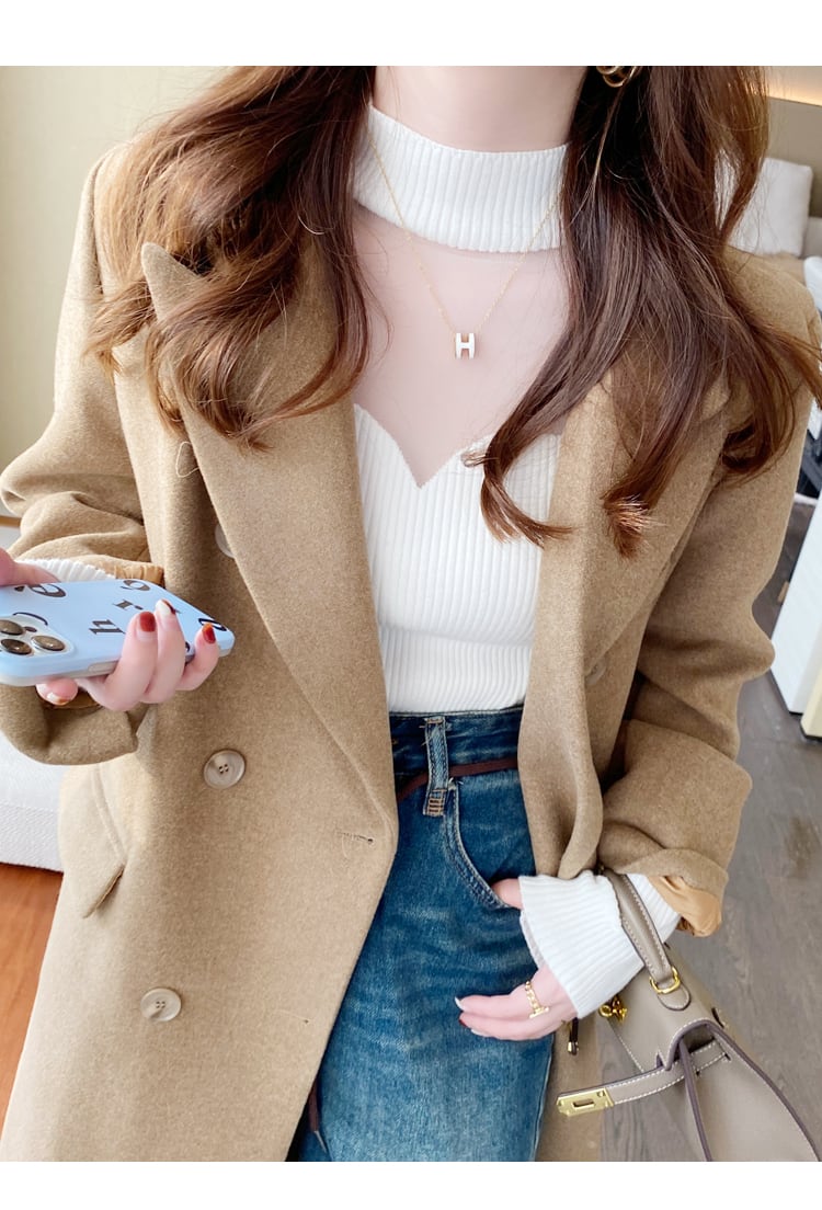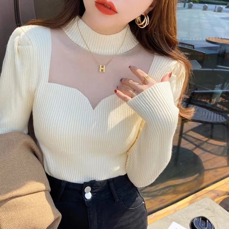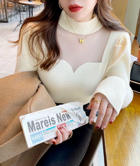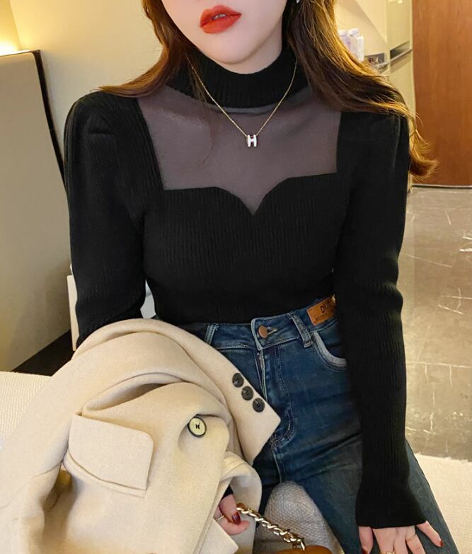 【tops】韓国風3色ハーフネック長袖レース切り替え着回しニットセーターF4418
