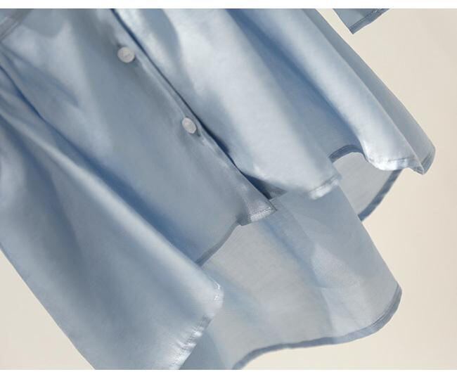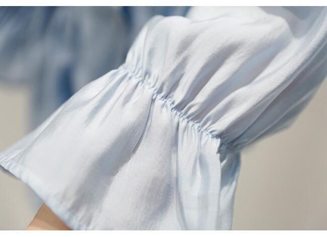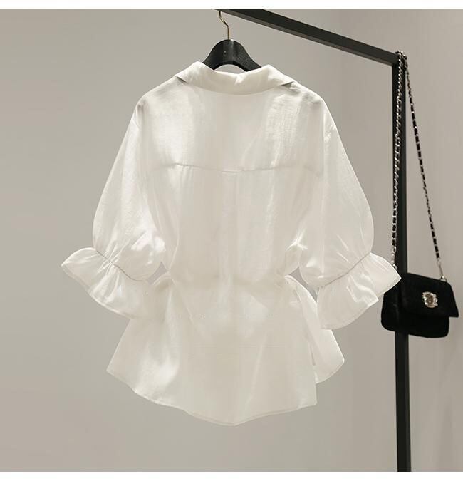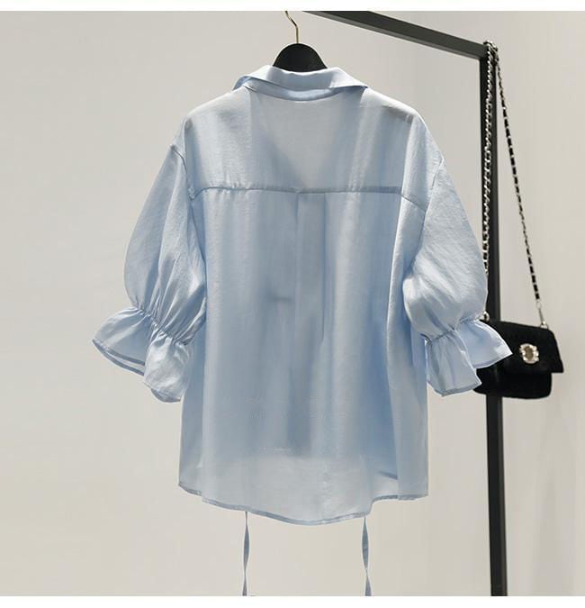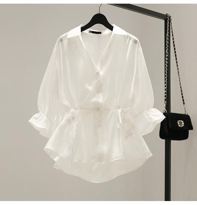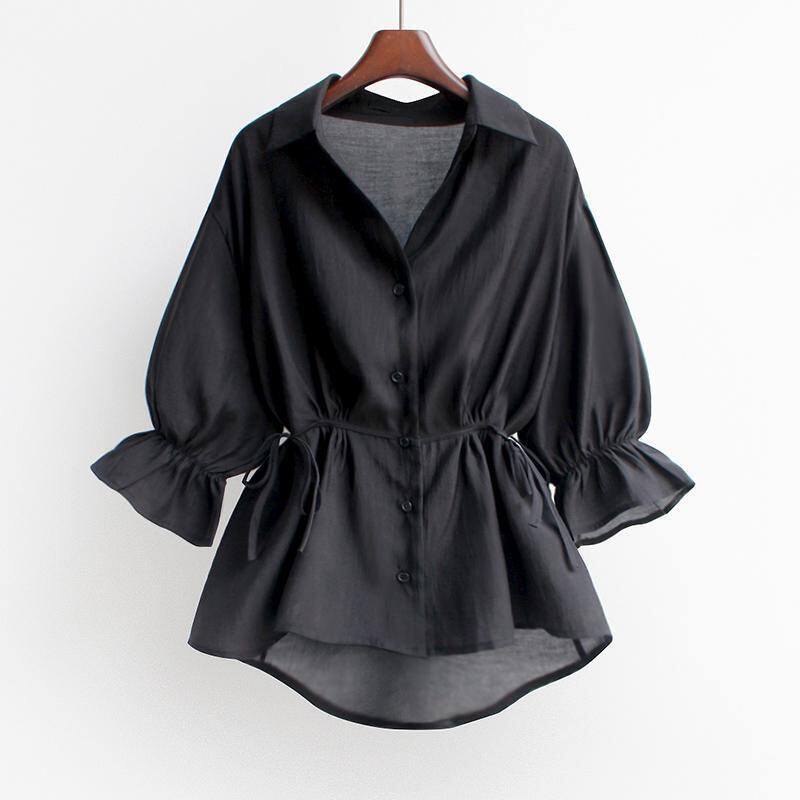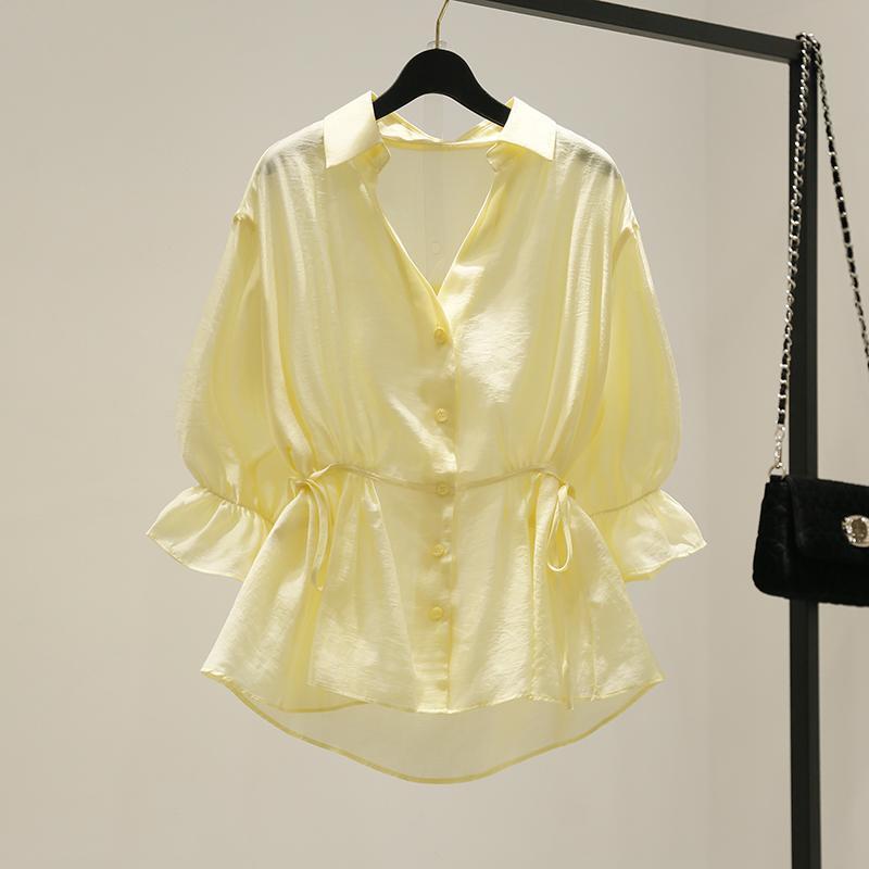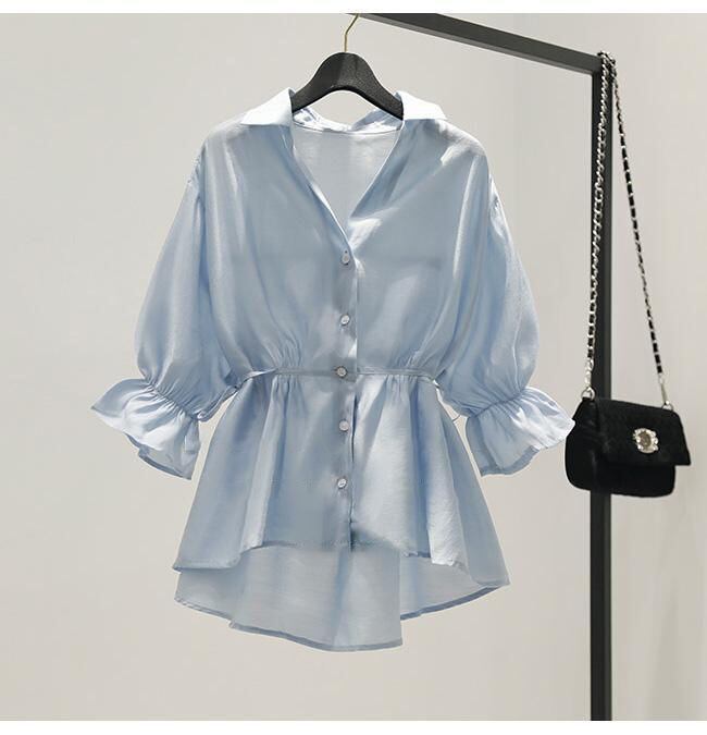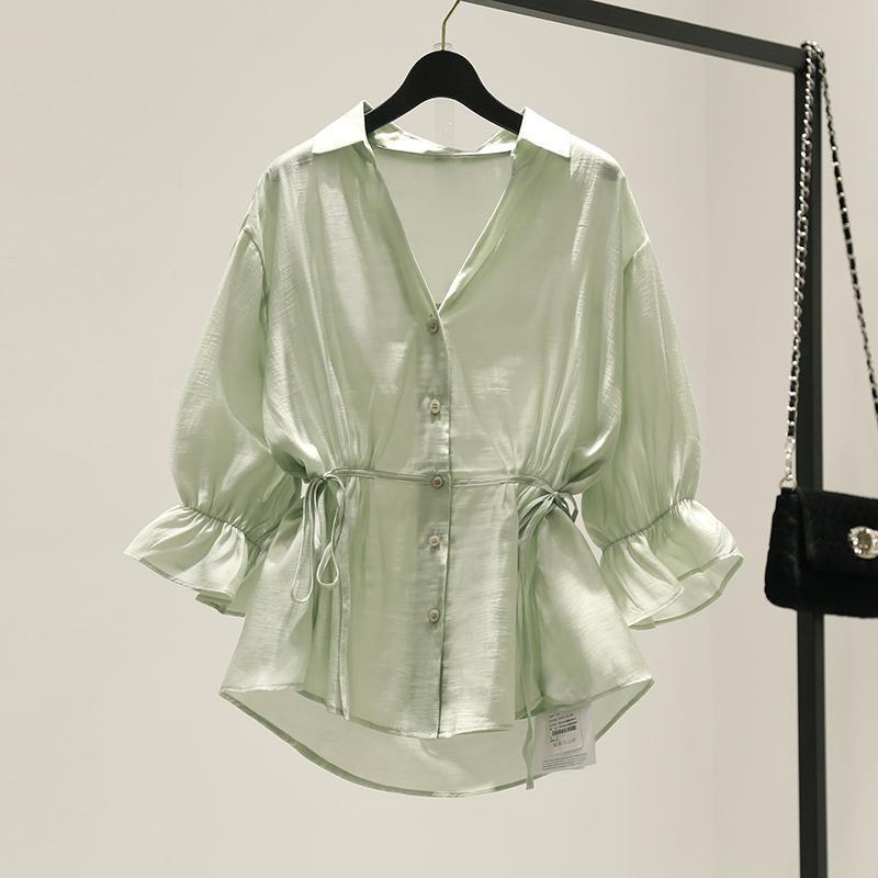 【tops】Vネック美人度アップ!韓国系夏ルーズスウィートフリルシフォンシャツ